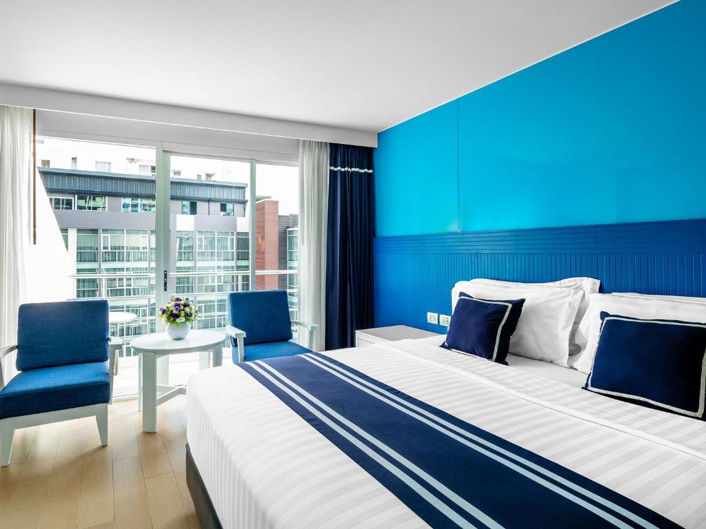 تم های آبی و سفید در هر اتاق وجود دارد. هر کدام دارای امکانات تهیه چای/قهوه و تلویزیون صفحه تخت با کانال های کابلی هستند.