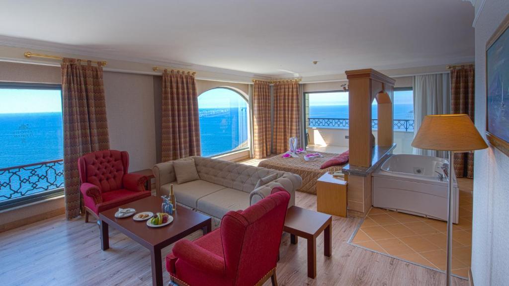 اتاقهای بزرگ هتل مجهز به مبلمان مدرن هستند و به بالکن خصوصی باز هستند. همه آنها دارای تلویزیون ماهواره ای هستند و برخی دارای اتاق نشیمن مجزا و حمام آبگرم مجلل هستند. همه واحدها دارای منظره دریا یا کوه هستند.